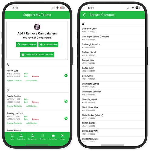 Campaigners can be added by selecting a contact from the phone's contacts or by manually entering their name and phone number.