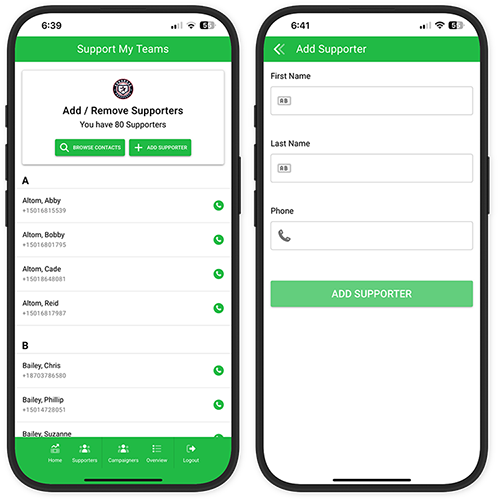 Supporters can be added by choosing a contact from the phone's contact list or by manually inputting their name and phone number.